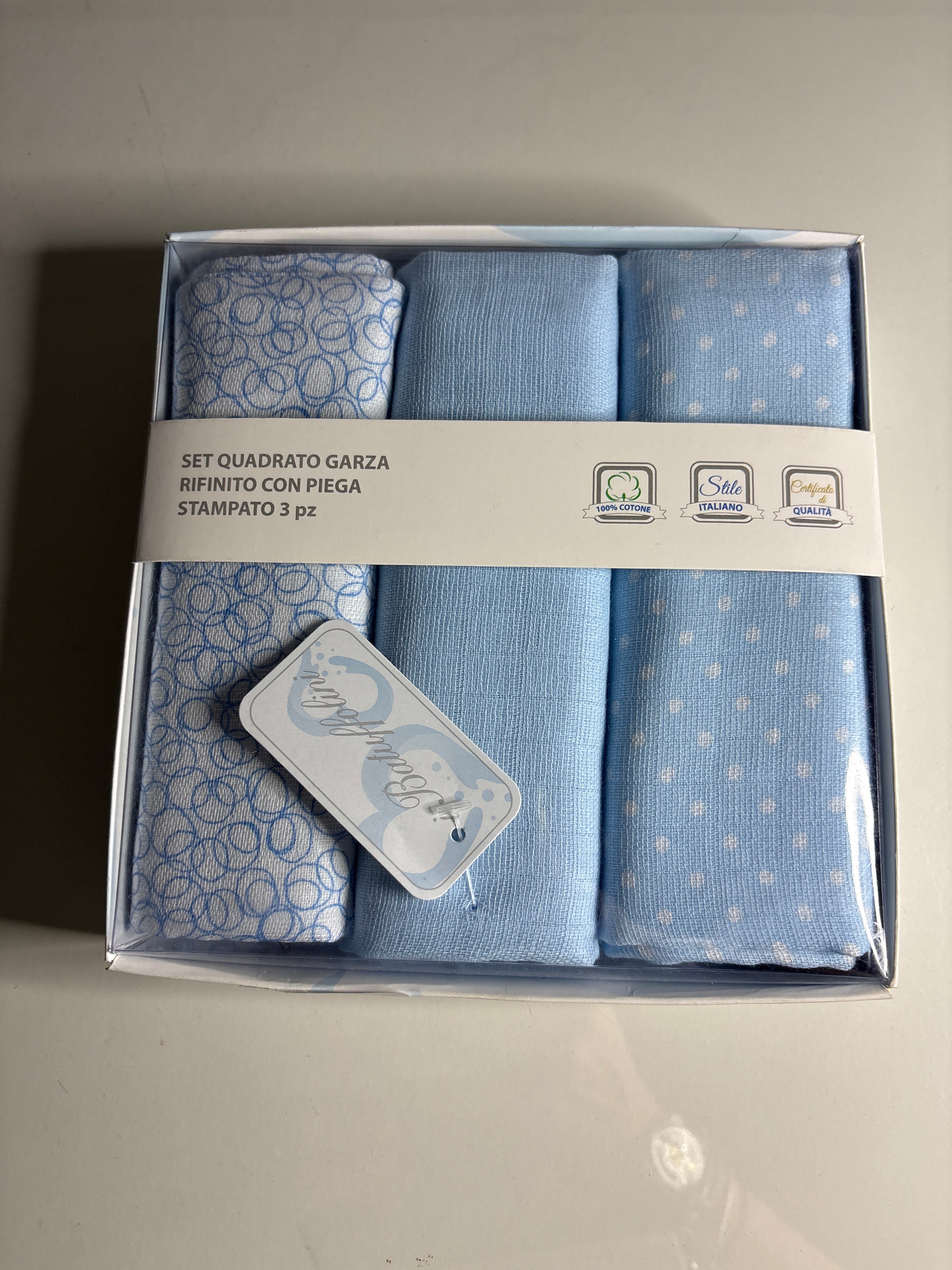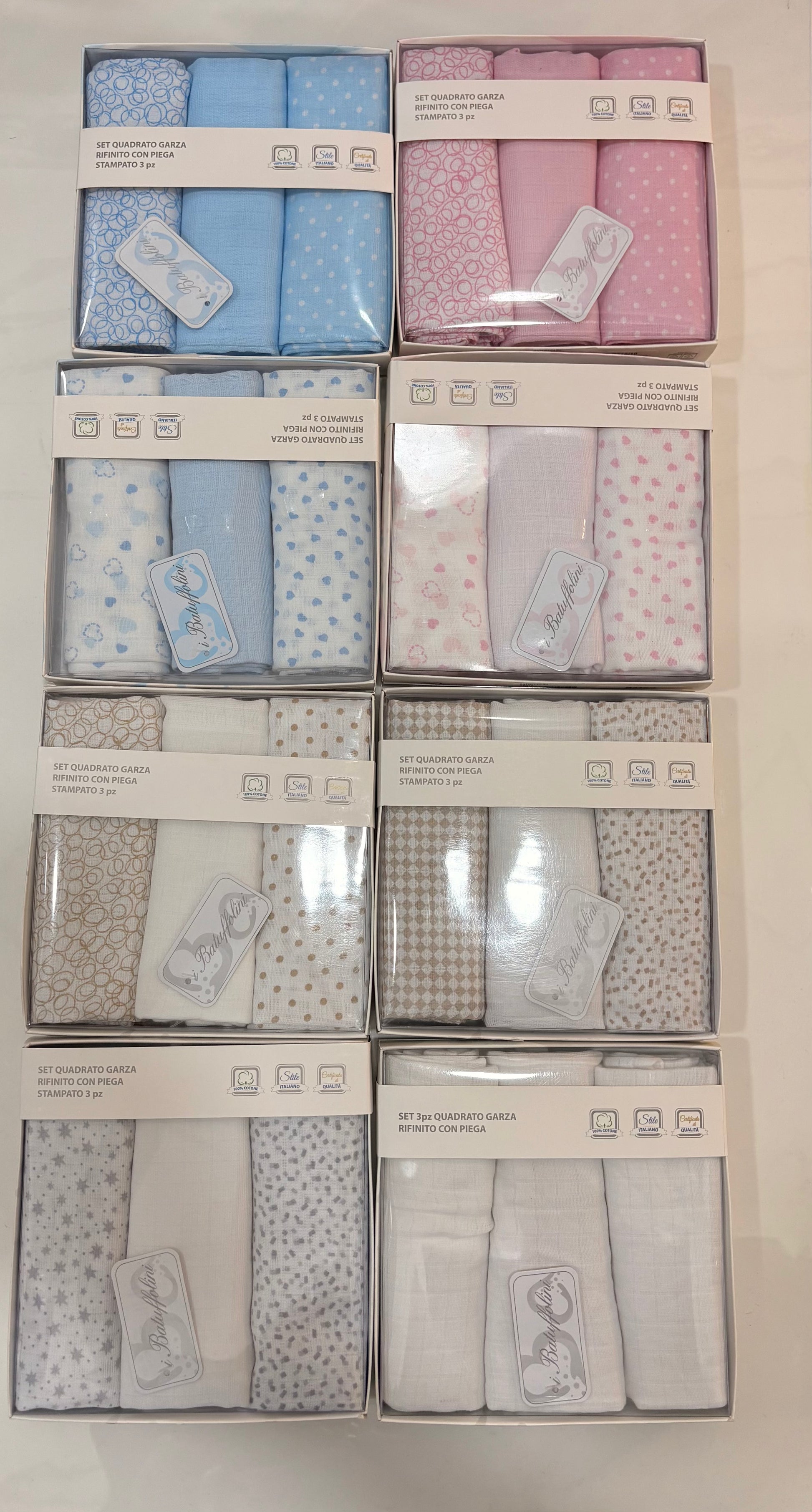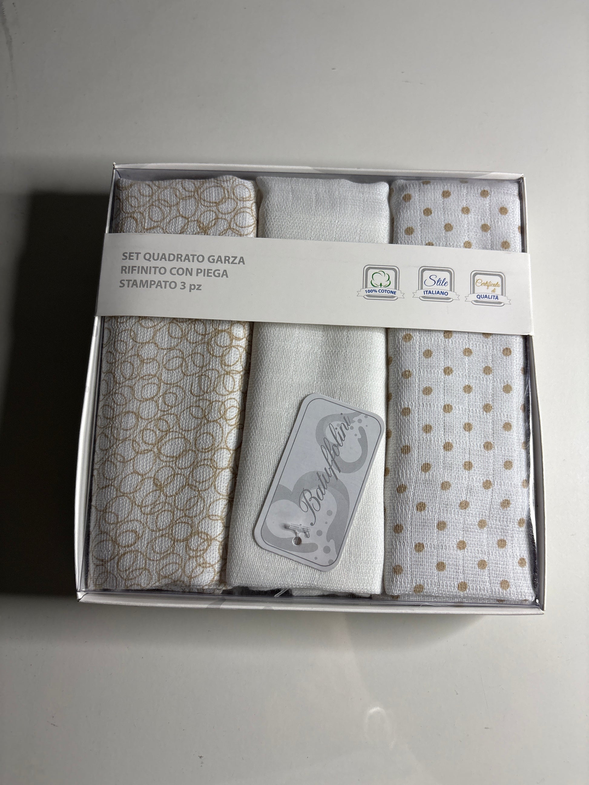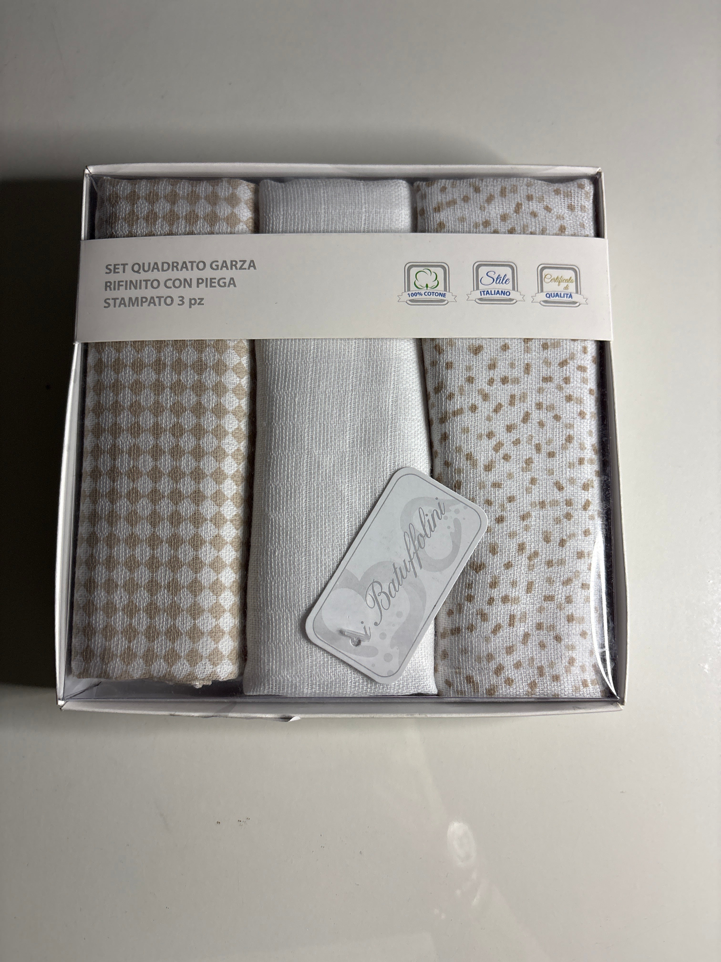 Set quadrato garza rifinito con piega stampa, tre pezzi, 100% cotone