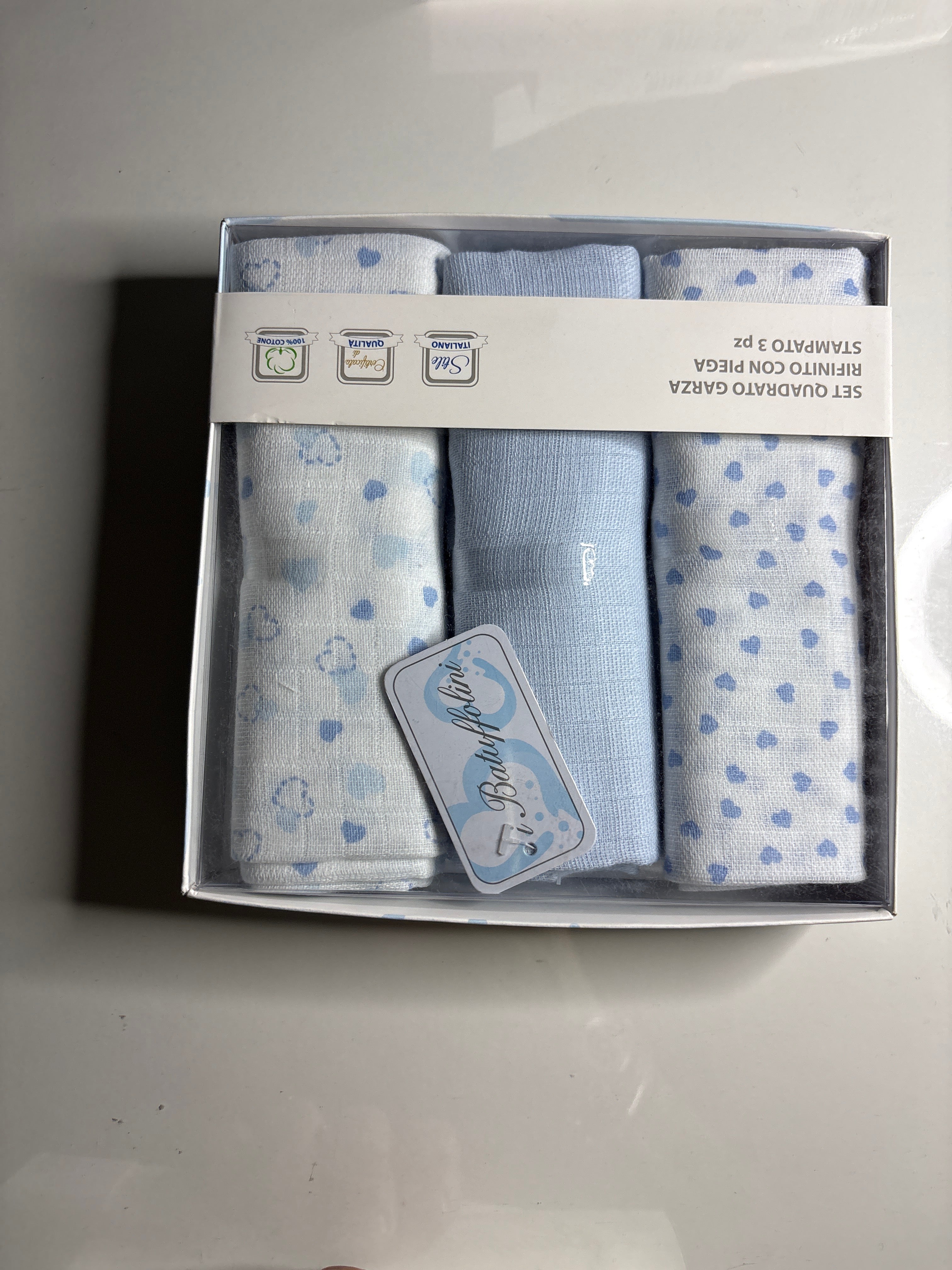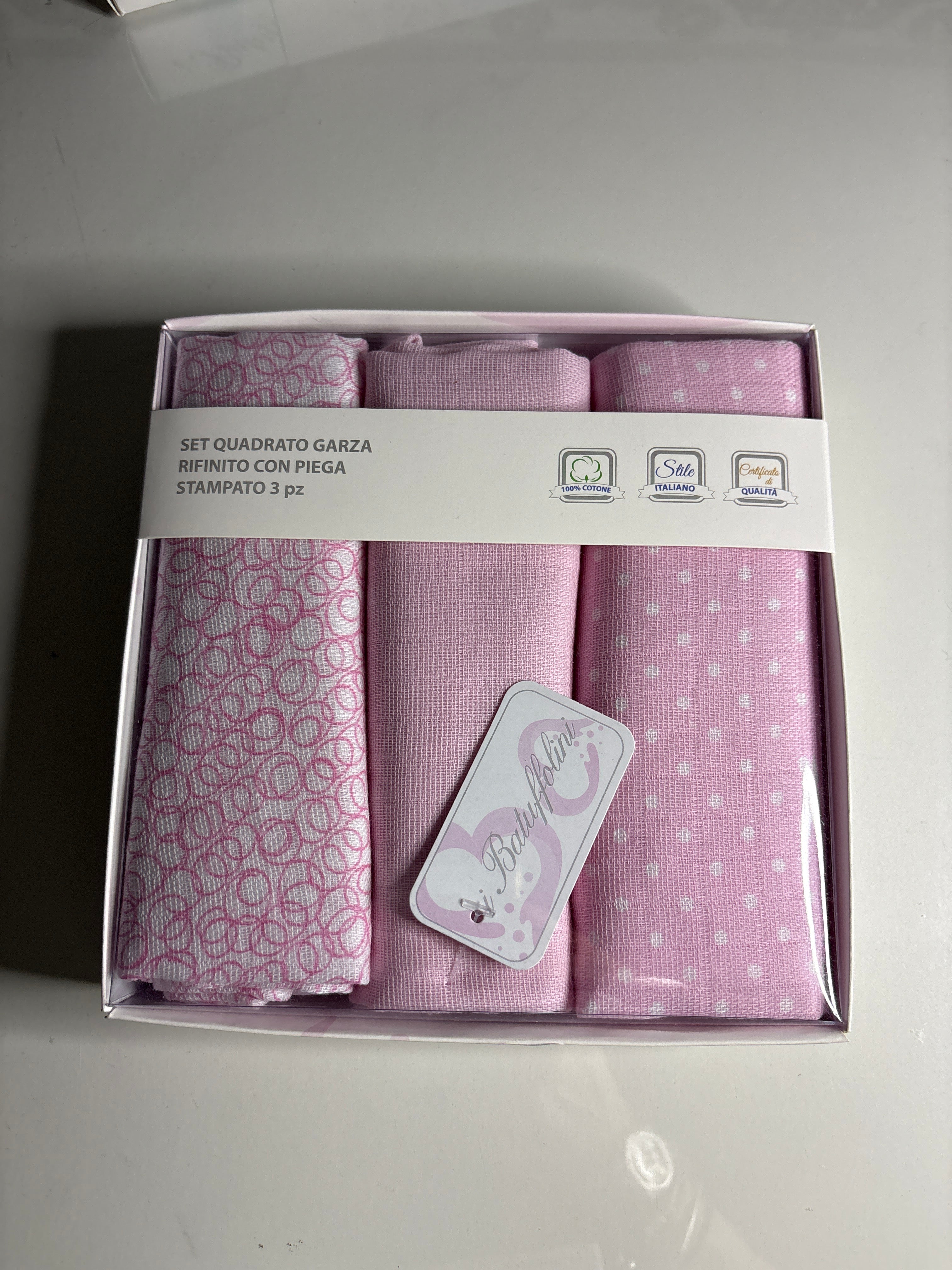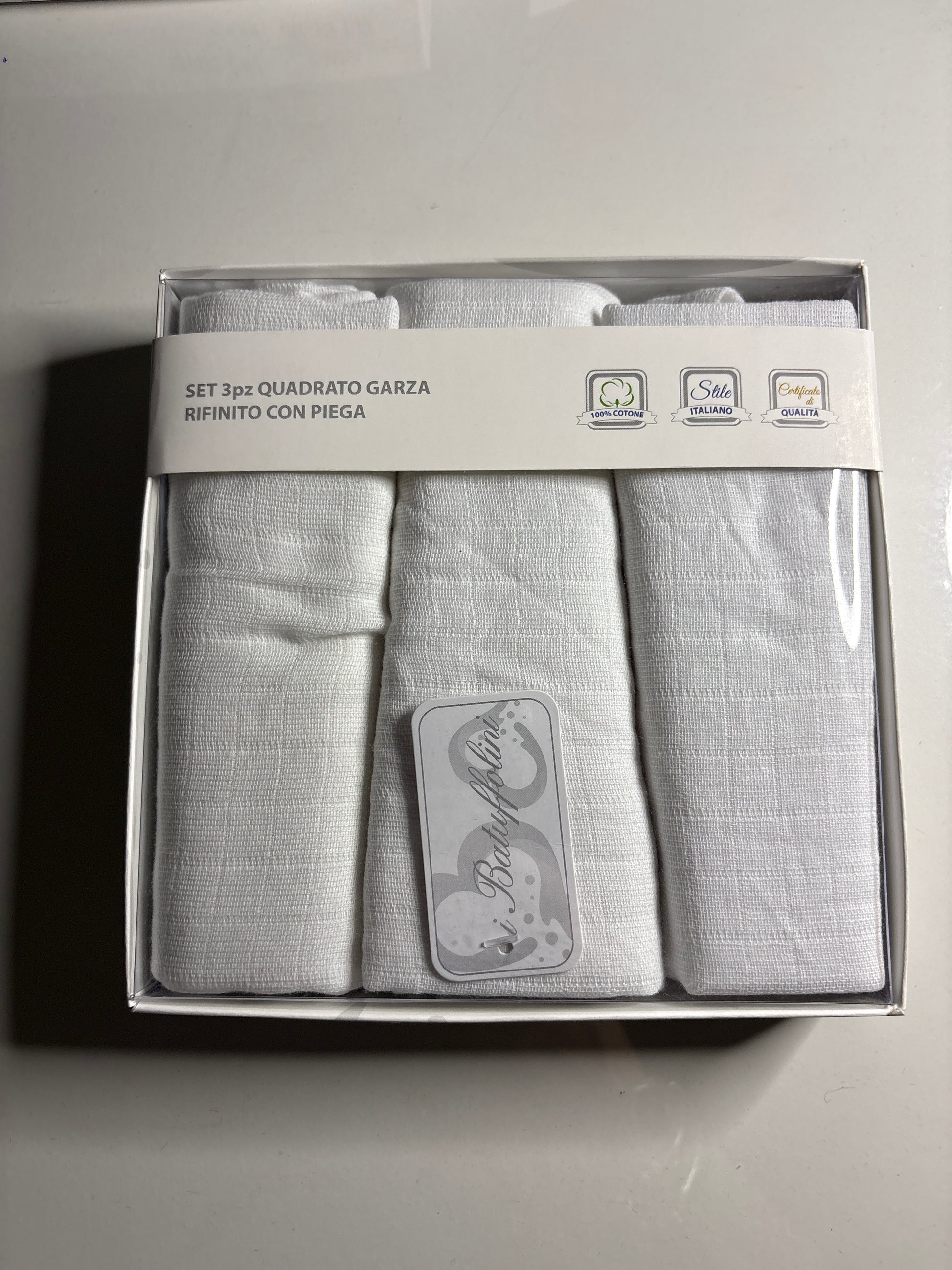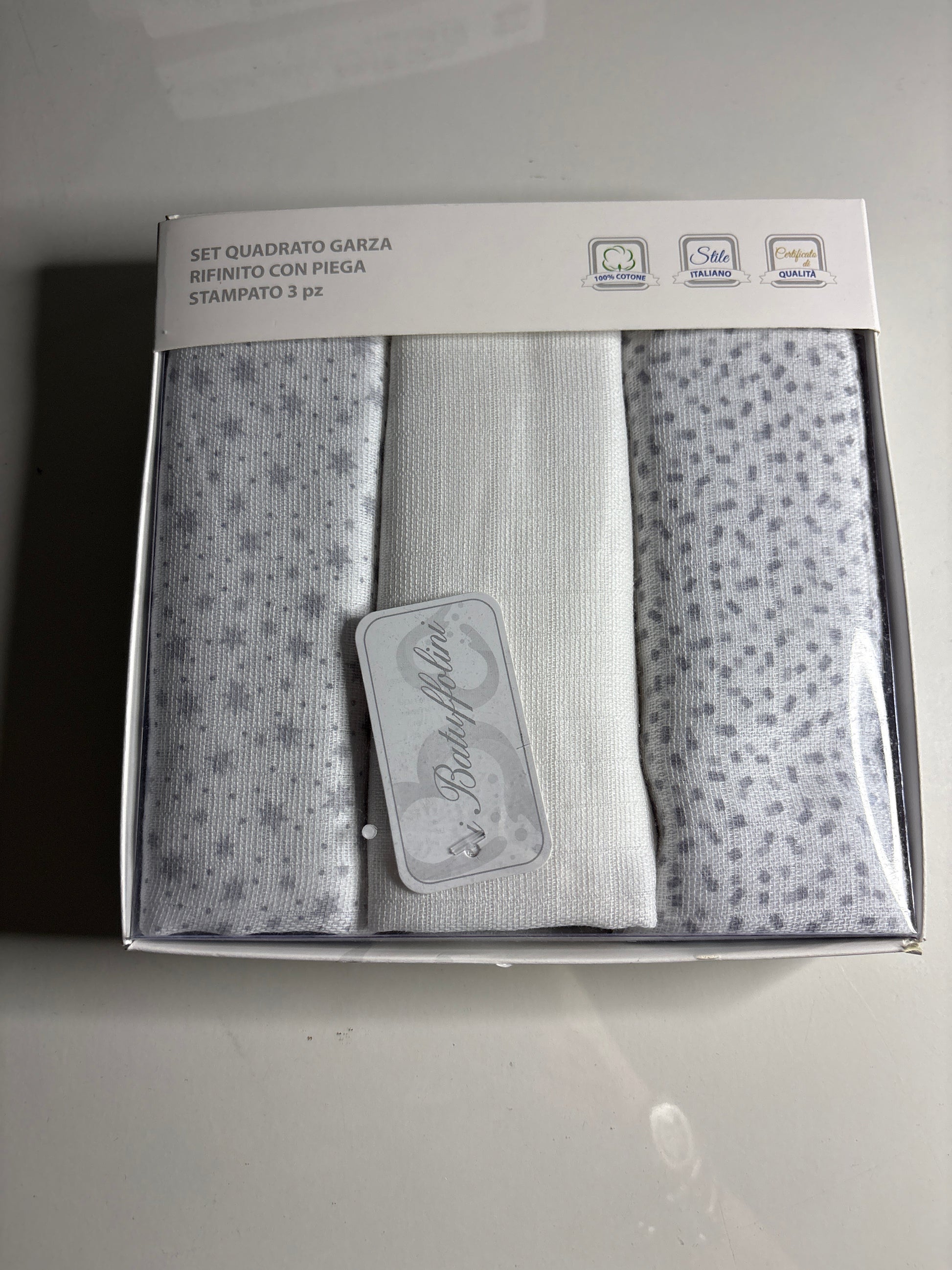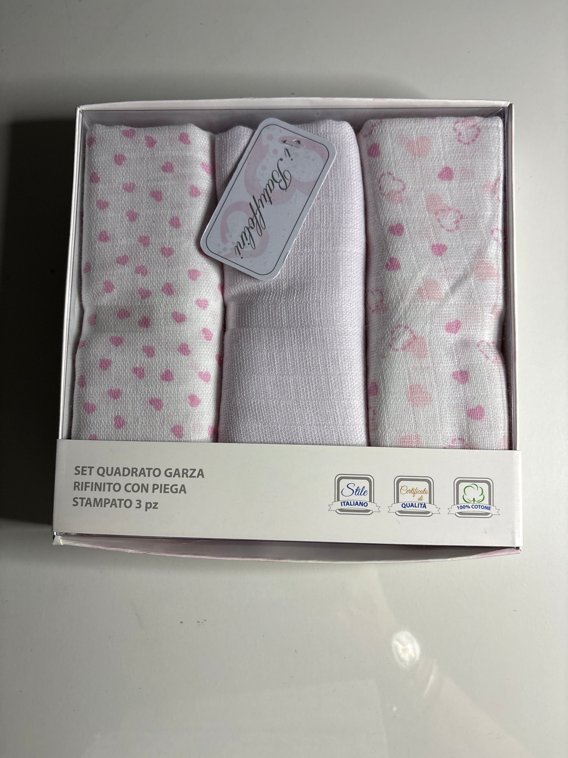 Set quadrato garza rifinito con piega stampa, tre pezzi, 100% cotone