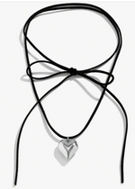 Il design prevede un doppio giro attorno al collo e un elegante fiocco frontale, da cui scende un ciondolo a cuore in metallo lucido (2,4 cm).